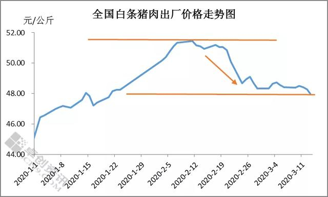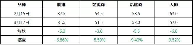 猪肉价格对终端消费敏感程度较高,波动幅度也显著大于生猪。作为猪肉的原料成本,在消费持续疲软的现阶段,猪价下滑拖累猪肉价格快速走低。如下图所示,卓创监测截至3月17日,全国瘦肉型白条猪肉出厂均价47.74元/公斤,较月初下滑0.75%,较2月高价下滑幅度达6.81%。