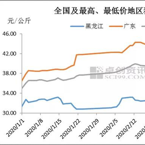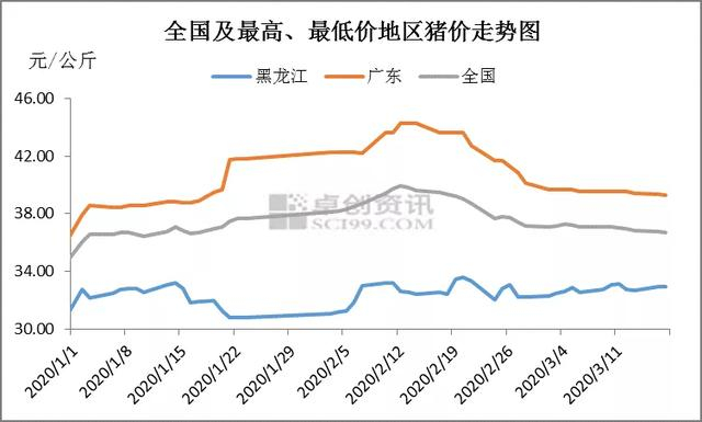 近期国内生猪价格呈现缓慢下滑的态势。卓创监测截至3月17日全国外三元出栏均价36.72元/公斤,较月初下滑1.02%,与江苏36.68元/公斤较为接近。最低价仍为黑龙江的32.94元/公斤,最高价为广东39.30元/公斤。