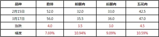 但与之相对的冻品价格则是反向上涨。2月中旬国内冻品走货滞缓,企业出货意向强烈,加之工厂多未复工,冻品价格低位难涨。3月上旬开始,随着企业的逐步复工,冻品走货略有加快,加之进口猪产品看涨预期强烈,冻品价格开启上涨模式。