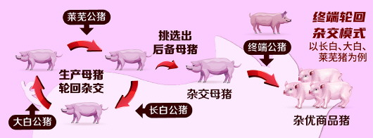 四是终端轮回杂交模式。结合以上二、三两个体系的优点,但是父母代母猪的母本杂种优势率比终端杂交模式要低一些。