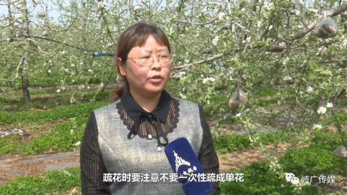 【岐山县果树蚕桑工作站农艺师 李晓荣:当前是苹果树盛花期,为了提高坐果率,确保产量,疏花时要注意不要一次性疏成单花,先疏弱花序,然后按距离疏开过稠过密的花序,约隔20cm留一个花序,同时密切关注天气预报,做好霜冻防御。】