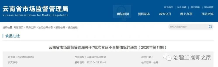 2020年4月22日,云南省市场监督管理局发布2020年第11期食品安全监督抽检信息通告,其中食用油、油脂及其制品抽检不合格2批次。分别为: