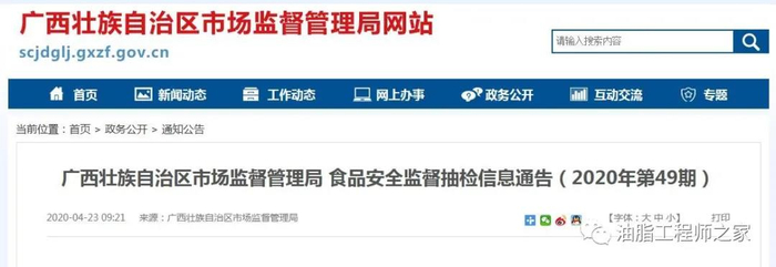 2020年4月23日,广西壮族自治区市场监督管理局发布2020年第49期食品安全监督抽检信息通告,其中食用油、油脂及其制品抽检211批次,检出1批次不合格。