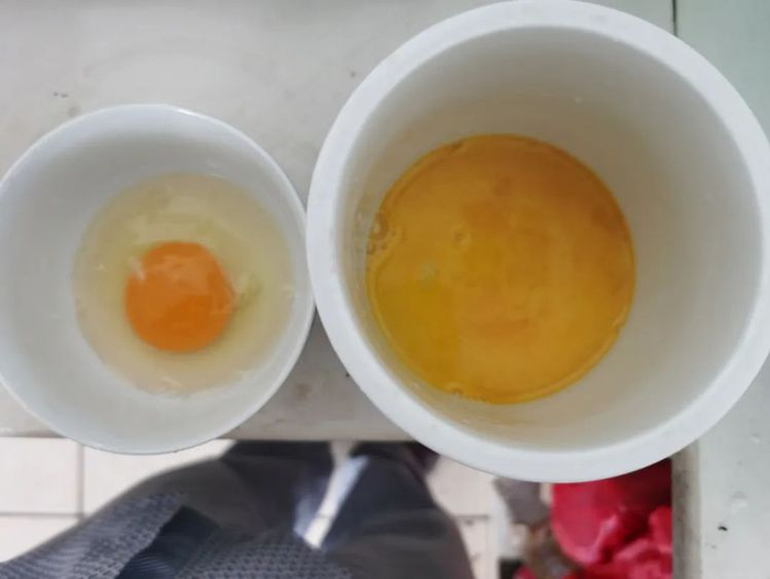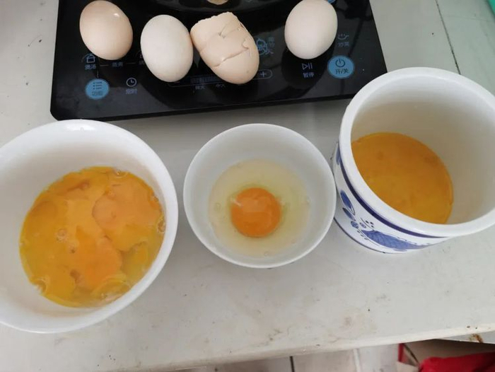 周先生打开的家中鸡蛋。左右是散蛋黄,中间为正常好蛋。