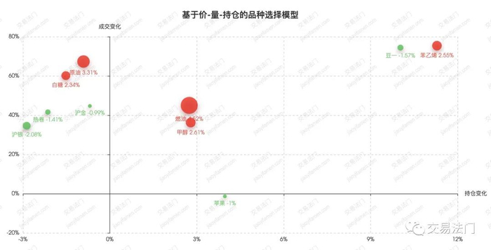 相反,当一个品种从价格低位出现减仓、放量、调整,或者一个品种从高位出现减仓、放量、调整,这两种情况下,行情继续的动能已经衰竭,往往适合做动量反转策略,做一个阶段性的反转,然后再去关注后期增仓情况下价格的变化方向。