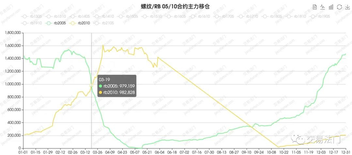 显然,在3月19日之前,RB2005是一波低位起来的上涨行情,当主力在这天完成换月之后,盘面走出了一波截然相反的下跌行情,价格基本上又回到了这波上涨行情的起点。可见,主力完成换月时,盘面的交易逻辑确实容易发生切换。