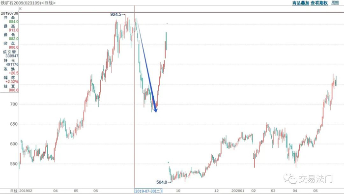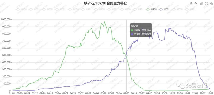 我们发现,当时完成换月的时间是2019年7月30日,我们再来看一下,当时i1909合约是什么时候开始下跌的,结果也是恰好出现在这一天。