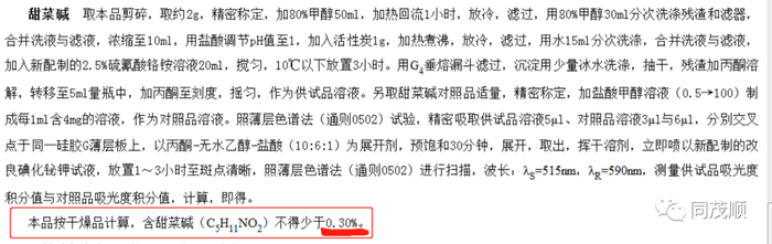 本品按干燥品计算,含甜菜碱(C5H11NO2)不得少于0.50%。(2015版中国药典薄层色谱法不得少于0.30%)