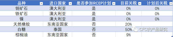 从上面的减税计划表中可以看出,棕榈油,白糖和天然乳胶不在RCEP减税计划范围内。铜,铁矿,镍等的关税目前为零,参加计划之后依旧维持为0%,RCEP减税计划对大部分进口大宗商品的影响有限。