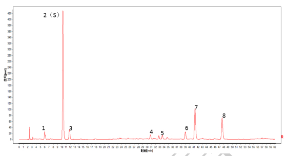供试品色谱中应呈现8个特征峰,并应与对照药材参照物色谱中的8个特征峰相对应,其中2、4、5号峰的保留时间应分别与相应的对照品参照物峰的保留时间相同;与绿原酸参照物峰相应的峰为S峰,计算各特征峰与S峰的相对保留时间,其相对保留时间应在规定值的±10%范围之内,规定值为:0.58(峰1)、1.15(峰3)、3.80(峰6)、4.02(峰7)、4.64(峰8)。