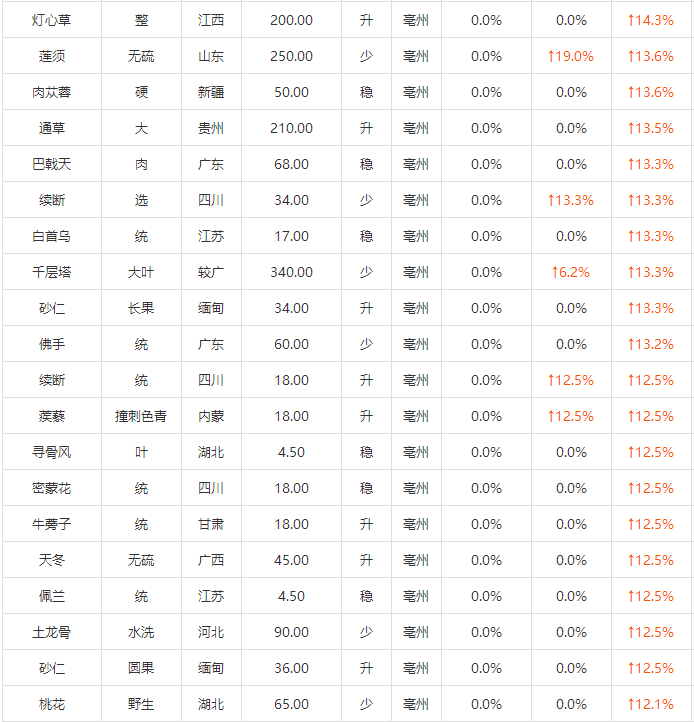 其中,蛤蚧涨幅最大,三个规格位列涨价排名榜前三,目前小对、中对、大对三个品规的价格分别是80/kg、90/kg、100/kg,月涨幅分别为220.0%、157.1%、138.1%。