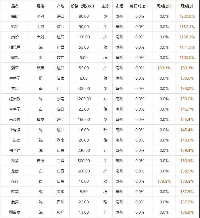 昨日,药通社发布了亳州市场截止4月18日中药材涨价品种排行榜,其中月涨价幅度超过100%的有蛤蚧、相思豆、鹤虱等。
