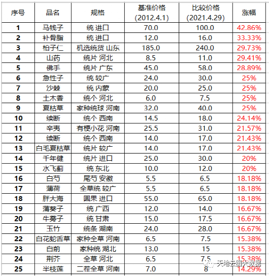 4月份中药价格上涨前25名