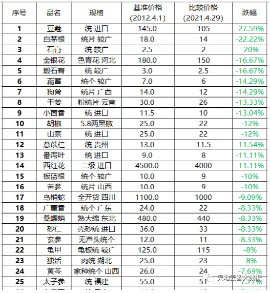 4月份中药价格下跌前25名