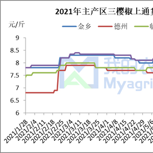 今年印度辣椒行情可以说一地鸡毛,我们在前边也分析过,由于信息的不对称性,今年印度椒进口量明显增加,2021年1-5月份,辣椒干及辣椒粉进口总量达到10.68万吨,同比增加56.25%。而大量印度椒进入国内之后,也遭遇了重重销售困境,货多,质量参差不齐,销售恶性竞争,价格一度陷入尴尬境地,另外今年越南及缅甸椒价格低位,对于印度椒价格上涨也起到了一定的抑制作用,导致印度辣椒价格持续低位,截至目前,带把,s17,销售价格参考8.60-9.00元/斤,其销售价格一度接近国内三樱椒,使得三樱椒价格上涨继续带来阻力。
