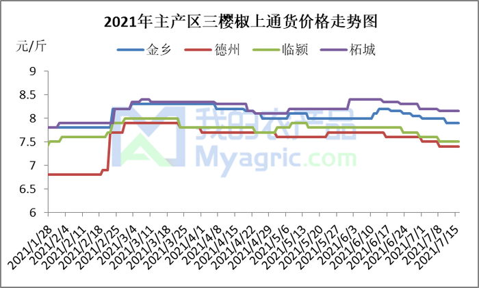 从上图中可以看出,进入7月份之后,国内小椒产区辣椒价格走势表现震荡下行。截至7月16日,山东金乡产区冷库三樱椒,上通货,价格参考7.90-8.00元/斤,较本月第一周下调0.05-0.10元/斤,但下跌势头并没有终止与此,存货商部分让利出售情况较多,成交价格似乎有继续下探空间。