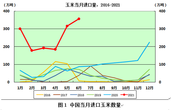 根据国家粮油信息中心发布的7月饲用谷物供需报告,预计2021年我国玉米种植面积和产量都将有所回升:其中种植面积预计4290万公顷,同比增加4%;产量预计2.735亿吨,同比增加4.9%,主要原因是由于种植收益不如玉米好,导致今年部分大豆种植土地改种玉米,预计今年大豆种植面积减少了68万公顷,而玉米种植面积增加了164万公顷。由于国内玉米的“价格高地”效应以及饲料需求大增,国外玉米大量涌入中国,2021年6月我国进口玉米357万吨,同比增加3倍,今年前6个月我国累计进口玉米1530万吨,同比去年增加了1164万吨,即增加2.35倍(见图1)。