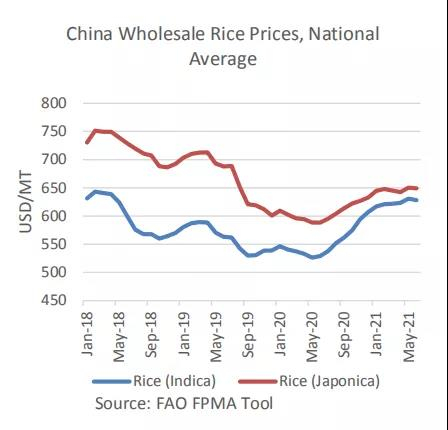 自2020年中期以来,中国的长粒大米价格上涨了近20%。南亚供应商的价格大幅下降,这有助于解释进口激增的原因。最近,政府拍卖长粒大米的步伐似乎有所放缓。预计中国将继续以较高的速度进口长粒米和碎米,而中粒米的进口继续保持疲软。2021年,美国农业部预计中国大米进口将增长近20%,达到380万吨。