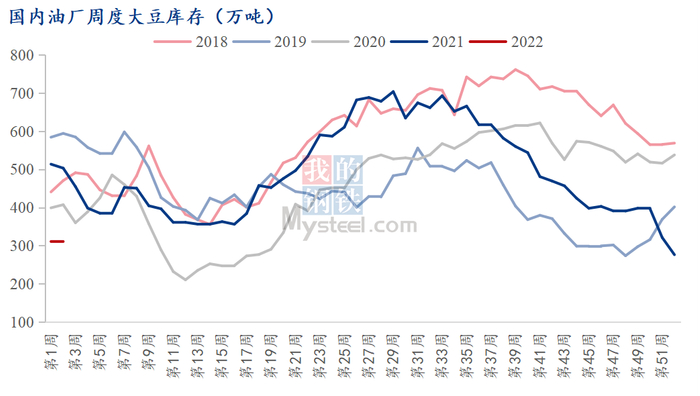 但油厂开机率的不断下滑却未能阻止油厂大豆库存的下滑,相反由于12月份商业大豆到港量偏低的影响下,国内油厂大豆库存不断下降,反过来又压制油厂开机率回升,截止2022年第1周1月7日,Mysteel数据显示全国油厂大豆库存310.76万吨,较上周增加34.59万吨,增幅12.52%,同比去年减少202.87万吨,减幅39.5%。