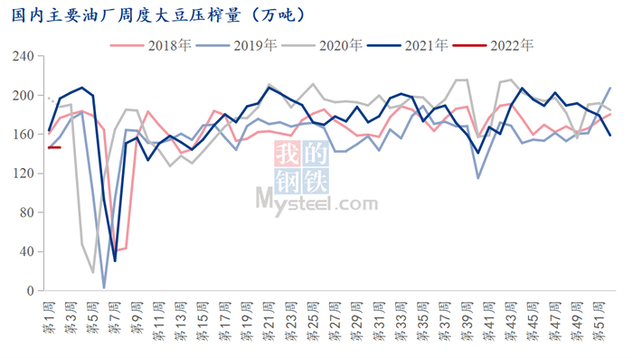而国内方面,从供应的角度来看,受到2021年9-10月份超低的进口大豆量影响,叠加2021年12月国内油厂商业大豆到港量偏低的双重影响,因此国内12月份的豆粕供应出现明显的减少。从下图Mysteel监测的数据可清楚的看到自2021年第47周后在达到周度压榨量202.18万吨的高点之后,油厂大豆周度压榨量持续走低,与往年12月压榨量季节性上升趋势形成明显反差。2021年12月,全国油厂大豆压榨789.93万吨,较11月份减少62.26万吨,减幅7.31%;较去年同期减少11.05万吨,减幅1.38%。