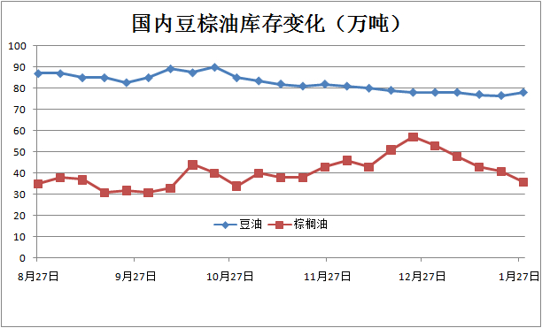 监测显示,1月24日,全国主要油厂豆油库存78万吨,比上周同期增加1.5万吨,月环比基本持平,同比减少4万吨,比近三年同期均值减少33万吨。本周大豆压榨量将明显回落,但下游企业提货放缓,预计豆油库存或继续小幅上升。