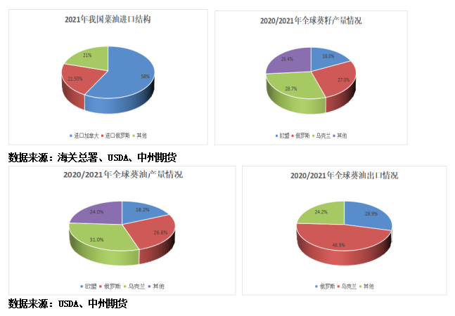 2、俄乌作为全球第四大植物油葵籽油的两大主产区,地缘风波也引发其价格骤增;据农产品网站数据显示,欧洲4月船期葵花籽油2月23日价格增至1700美元/吨,涨幅超10.39%。据USDA数据显示,2020/21年度俄乌两国的葵油出口份额占全球的76%,对国际供应占据主导地位。