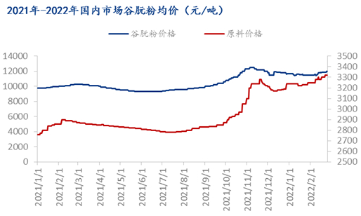 导致谷朊粉价格上涨的主要原因有:一、原料方面,小麦市场价格整体呈上涨态势、加之节后前路粉走货一般,迫于原料成本压力,面企为平衡利润,不断上调后路粉价格。原料价格上涨,谷朊粉厂家在生产成本压力下,上调谷朊粉价格。二、开工方面,由于原料价格偏高,小麦淀粉下游需求不佳,小麦淀粉走货一般,厂家为避免库存累积,开机率约维持在40%左右,部分小厂开工不稳,暂停生产。少数厂家月初开工意愿不强,到本月20号以后才陆续开工,所以中小厂谷朊粉产量不高,供应偏紧。三、下游需求方面,节前下游厂家受疫情影响,提前停产,节后厂家逐步恢复生产,采购积极。但目前部分下游厂家以消化前期库存为主,采购谨慎。四、出口方面,本月大厂谷朊粉出口订单较多,且出口退税后价格高于国内价格,大厂谷朊粉价格高位运行,国内价格在12500-12800元/吨,对国内小厂价格有一定带动作用。五、生产费用方面,少数厂家受天然气涨价影响,谷朊粉烘干费用较月初增加70元/吨,生产成本压力下,不断上调谷朊粉价格。