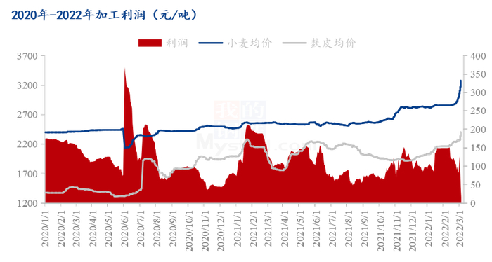 从制粉企业利润来看,近期一直处于较低水平,很多企业处于亏损状态。小麦价格上涨速度过快,但是面粉、副产品处于需求淡季,价格难以跟涨。一季度是面粉需求淡季,往年同期价格呈现缓跌态势,今年受原粮价格上涨影响,近期价格呈现涨势,但是从需求来看,终端需求饱和,且市场竞争激烈,因此面粉价格继续上涨动力不足。饲料企业今年整体产能较往年有所下降,对高价副产品接受程度不高,收购满足刚需为主。制粉企业运营较为艰难。