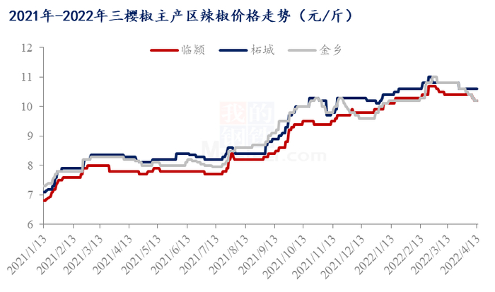 上图是国内三樱椒主产区价格走势,从走势中不难看出,春节过后,国内辣椒价格从高点逐渐回落,3月中旬之后,价格继续下移。截至4月13日,山东金乡地区三樱椒,上通货,价格10.20元/斤左右,较月初下调0.20元/斤左右。河南临颍,三樱椒,上通货,价格10.30元/斤,较月初下调0.20元/斤左右;柘城,三樱椒,价格10.60元/斤,价格较月初变化不大。
