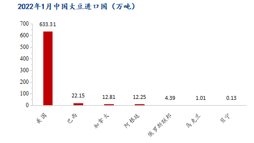 据海关总署数据显示,中国2022年1月大豆进口量为885万吨,其中主要的进口国家是美国、巴西、加拿大和阿根廷等国。其中美国大豆进口633.31万吨,占比71.56%;巴西大豆进口221.54万吨,占比25.03%;加拿大大豆进口12.81万吨,占比1.45%;阿根廷大豆进口12.25万吨,占比1.38%。