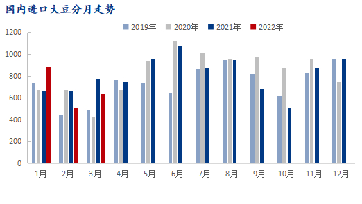 据海关总署数据显示 ,2022年4月13日公布,中国3月大豆进口同比下滑,因不利天气拖延巴西出利润不佳抑制需求。3月末达到纪录高位,因干旱导致头号出产国巴西收割推迟,令大豆供应趋紧。同时压榨企业在采购方面进度缓慢,生猪利润不佳波及压榨利润。叠加国内抛储情况,大豆供应量或将继续回升。