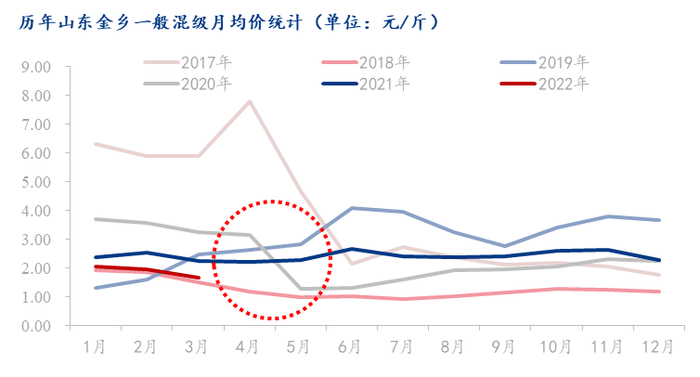 近六年山东金乡大蒜一般混级价格对比显示:2022年一季度价格与2018年价格接近。2022年一季度均价为1.89元/斤,同比2018年价格上涨0.13元/斤,涨幅为7.39%。同比2021年价格下跌0.49元/斤,跌幅为20.59%。从价格趋势来看,今年一季度价格较去年有明显的下滑,同2018年一季度趋势相同。近六年来,今年价格相对处于低位。