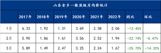 一、2022年一季度价格同环比双跌,六年同比处于低位。