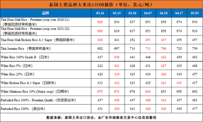 由于俄乌冲突期间人们囤积必需品,特别是大米等农产品和食品,基于粮食安全保障的需要,泰国与沙特阿拉伯等国家关系有所改善,中东出口需求剧增,加上泰铢持续疲软,利于提高其出口竞争力,在能源和大宗商品价格持续上涨的背景下,泰国大米出口报价整体走强。据统计,一季度泰国大米出口量同比增15%,3月份更是创下近30年以来新高。