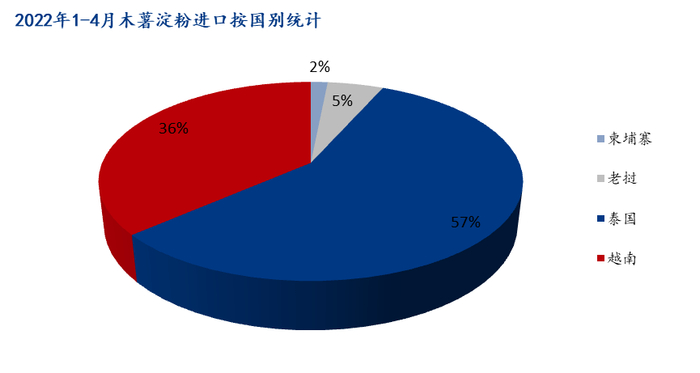 导语:目前我国对木薯粉的需求日益增多,而且木薯淀粉的进口数量占据总消费量的90%以上,主要进口国是泰国、越南、老挝、柬埔寨以及印度尼西亚等国。截至2022年1-4月国内木薯淀粉进口总量为167.71万吨,较去年同期131.91万吨增加35.79万吨,同比增幅27.14%,而当前国内木薯淀粉市场受人民币汇率、需求偏弱等影响下,短期内木薯淀粉市场或将呈现供需僵持态势/现货价格或将呈现高位震荡态势。