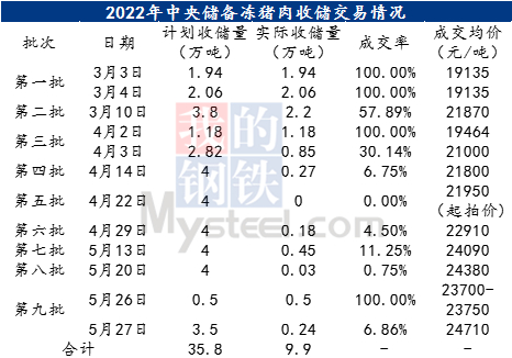 据统计,5月26日-27日进行的中央储备冻猪肉收储是今年第九批次,九批次收储总计划量35.8万吨,实际收储总量9.9万吨,