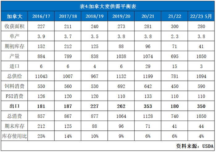 参照加拿大统计局数据,加拿大大麦库存在3月底降至1696吨,仅为去年同期的一半,是1981年以来单月最低值。大麦库存降低主要源于产量减少以及需求增加。同时,参考美国农业部5月供需报告,22/23年度大麦产量约为1050万吨,同比增加355万吨。产量增加的同时,大麦饲料消费增加也较为明显。22/23年度加拿大饲用大麦需求量约为590万吨,同比增加140万吨。另外,值得重视的是,美国农业部将加拿大新作大麦出口量调高至350万吨,同比增加170万吨。但是由于今年播种期间气温同比偏冷,影响作物播种进度和生长,如此高的产量能否达到预期需要良好的天气配合。