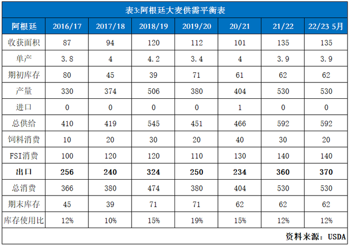 同时,根据美国农业部5月供需报告,22/23年度预计阿根廷新作大麦产量530万吨,与去年同期持平。出口方面,美国农业部小幅上调阿根廷大麦新作出口数量,预估22/23年大麦出口可提高至370万吨左右。我们认为按照大麦与其他谷物价差,大麦各区域间价差,阿根廷大麦出口不宜过度乐观。