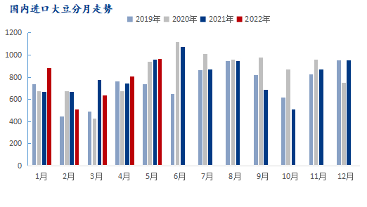 2022年6月9日,海关总署公布的数据显示,中国5月大豆进口量为967.4万吨,较4月大豆进口量的808万吨增加159.4万吨,环比增长19.72%;同比去年同期增加6.4万吨,增幅0.67%。相比2018-2022年间5月大豆进口五年均值914.4万吨,增加53万吨,增幅5.8%。因5月份为南美大豆的出口旺季,也是中国大豆进口量高的月份,从往年来看,一般2-3月份国内大豆进口量处于年内低位,但在到达4-6月份大豆进口量后会触及一个相对历史高位。