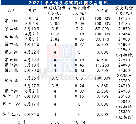 2022年国家累计进行十三批次放储,计划收储量51.8万吨,实际收储量10.14万吨。最后两次收储均以流标结束。