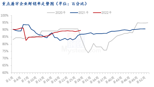 2022年上半年屠企平均鲜销率为87.68%,波动区间82.62%-91.27%,环比2021年上半年下降0.18个百分点。