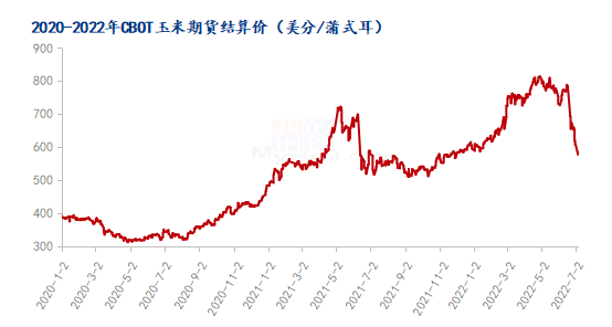 6月30日,CBOT玉米期货价格为619.75美分/蒲式耳,较1月3日589.25美分/蒲式耳,上涨30.50美分/蒲式耳,涨幅5.17%。上半年最高价为813.50美分/蒲式耳,最低价为587.50美分/蒲式耳,两者价差为226.00美分/蒲式耳。第一季度CBOT玉米期货价格呈现上涨态势,玉米市场供需偏紧,宏观环境出现通货膨胀,推动价格上涨。第二季度受地缘政治影响,CBOT玉米期货价格大幅上涨之后延续高位运行。6月底受宏观政策影响,大宗商品价格出现下跌,CBOT玉米期货价格同样出现下跌,幅度较为明显,目前价格水平基本与年初持平。