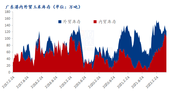 根据Mysteel农产品调研数据显示,2022年上半年广东港内外贸玉米库存整体呈稳定态势。2022年年初广东港内贸玉米库存38.5万吨,至6月底升至108.8万吨。2022年年初广东港外贸玉米库存84.8万吨,至6月底降至18.4万吨。上半年因进口谷物价格高位,国内玉米的需求量上升,广东港内贸玉米不断到货,库存上升。外贸玉米多以执行2021年前期合同到货为主,受俄乌局势影响,上半年进口玉米价格远高于国内玉米,国内企业多不考虑,因此外贸玉米库存不断下降。