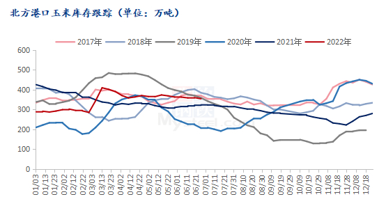 2022年上半年北港玉米库存呈现震荡上涨趋势。根据Mysteel农产品调研数据显示,北方港口年初玉米库存为288万吨,比去年同期低136.6万吨,为近五年同期第二低位,其中2020年年初210万吨为近五年最低,2021年年初424.6万吨为近五年最高;截止到6月底,北方港口玉米库存为353.8万吨,较年初增加65.8万吨,比去年同期高30.8万吨。1-2月临近春节,南方销区饲料企业有备货需求采购积极,促进产区农民售粮积极,港口贸易商收粮积极,使得港口到货量不断上升,北方港口发船数量较多。经历前期备货后,大部分销区饲料企业玉米库存在2个月左右,因上半年养殖需求疲软,饲料企业多采取滚动补库策略,少量采购,因此从3月开始至今北方港口玉米库存维持一个较平稳的态势。