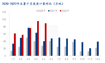 根据中国海关网数据,2022年1-5月份,国内进口木薯干总量380.32万吨,同期数据262.21万吨。