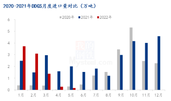 根据中国海关网数据,2022年1-5月份,国内进口DDGS总量8.61万吨,同期数据10.50万吨。