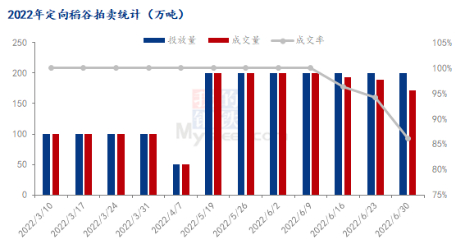 本年度定向稻谷拍卖自3月10日开始,周度投放总量在50万-100万吨,底价1500元/吨。自4月14日停拍,5月15日重启拍卖,周度投放量200万吨,拍卖底价东北地区1600元/吨,南方1700元/吨。截至6月30日,定向稻谷拍卖12次,总投放量1850万吨,成交1803万吨,成交率97.46%。地区分布方面,东北地区投放比重79%,其他省份占比21%。投放粮源年份方面,涵盖2014-2017年份稻谷。