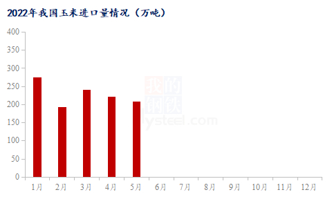根据中国海关总署公示的数据显示,2022年1-5月我国累计进口玉米1139万吨,同比下降2.90%。近几个月我国玉米进口量持续下降,4月进口量为221万吨,月环比下降8.30%;5月进口量为208万吨,月环比下降5.88%。
