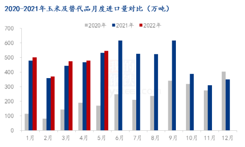 2022年上半年国际粮价不断上涨,进口玉米价格已经远超内贸玉米价格,进口玉米已无价格优势,而且目前国内下游需求疲软,进口玉米使用需求下降,预计下半年玉米进口量会持续下降。但在5月23日,我国商务部与巴西农业部签署了《巴西玉米输华植物检疫要求议定书》,或将打开巴西玉米进口,进一步促进两国农产品贸易发展,后续如何发展还需继续关注国家政策。