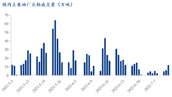 至于国内豆粕市场方面,从供给端来看,主要矛盾集中在受进口大豆利润倒挂影响,进口大豆采购进度偏慢,预计未来一段时间进口大豆到港量低。据Mysteel农产品数据显示,7-9月进口大豆预计到港量760万吨、650万吨和580万吨。对7-9月国内主要油厂的大豆压榨量预估暂为760万吨、780万吨和770万吨。仅此两项,届时9月底国内大豆去库预计320万吨。考虑到进口大豆拍卖出库150-200万吨,实际去库或在120-170万吨。截止2022年第27周7月8日当周,全国港口大豆库存为695.75万吨,则预计9月底有望降至520-570万吨。总的来说,三季度国内大豆库存将逐步进入到去库存阶段,豆粕将跟随这一趋势,但不会进入极度紧张的局面。